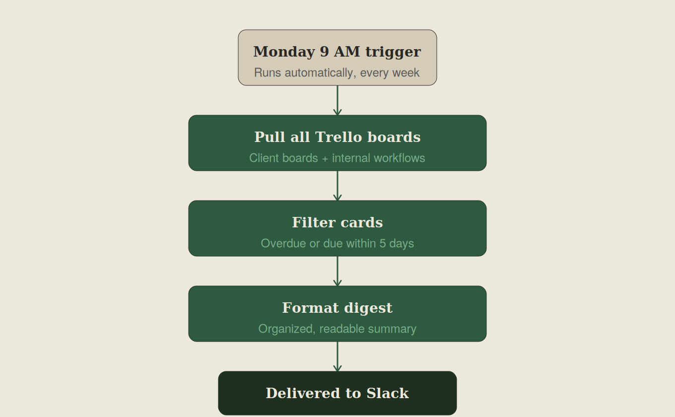 Here's what I built: an automated digest that pulls from all of her Trello boards every Monday morning at 9 AM, surfaces every card that's either overdue or due within the next five days, formats it cleanly, and delivers it as a Slack message — waiting for her when she opens her laptop to start the week.